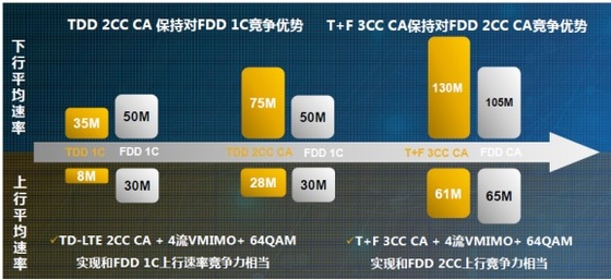 TDD/FDD融合组网对于中国移动有着多重的重要性:其一,只有TDD/FDD融合组网后结合载波聚合功能实现130M下行/60M上行才能确保在速率上时时都能领先FDD一步(如图所示);其二,只有TDD/FDD融合组网才能帮助中国移动摆脱其国际合作伙伴的FDD LTE用户漫游到中国移动网络上无4G可用的尴尬境地;其三,随着移动宽带步入物联网时代,当宽带由人的连接发展到“人+物”的连接,TDD(时分双工)技术适应非对称业务的优势会由于上行受限而变成劣势,所以TDD/FDD融合组网是必然趋势。